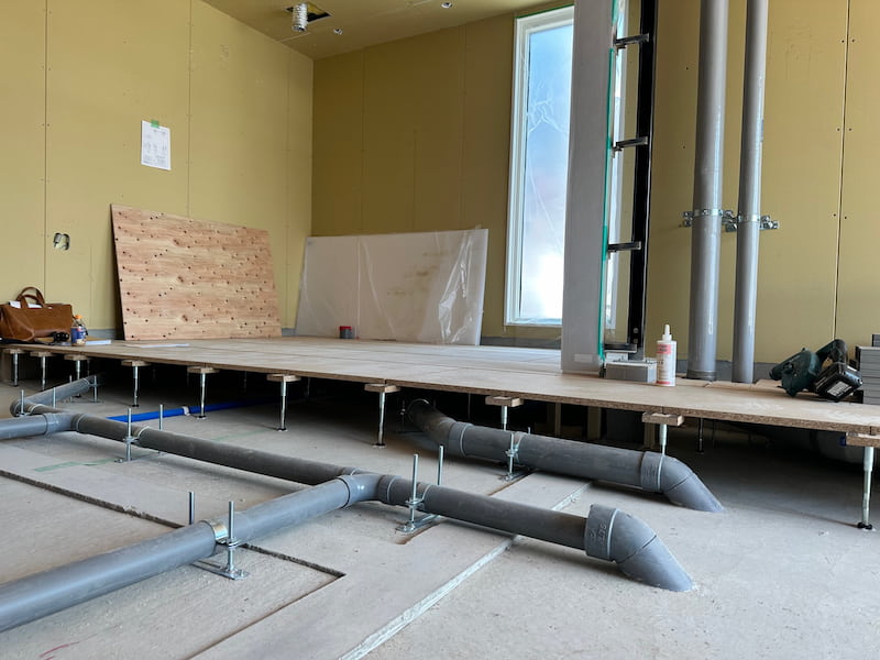 「床あげ」とは、コンクリートの基礎の上に、さらに一段床を組み上げる作業のことです。 病院には、水道の配管や電気のコード、酸素の配管など、たくさんの設備が必要になります。この「床下」にそうした大切なライフラインをしっかり通すことで、安全で機能的な病院の土台が作られていきます。