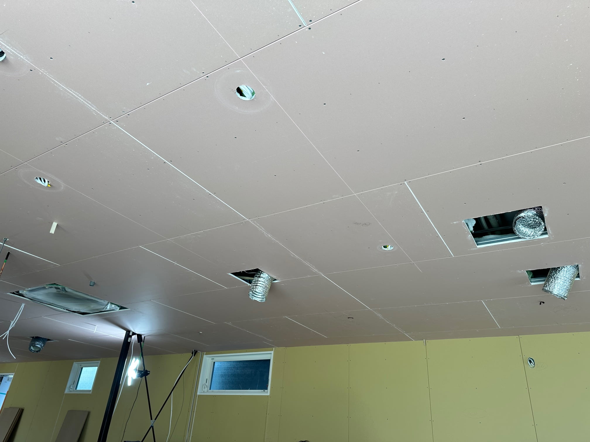 天井の骨組みが出来上がりました。 これまでは屋根の裏側まで高く吹き抜けていた空間に、しっかりとした天井が作られ、グッと部屋らしい雰囲気が出てきました。ここには照明や空調などが設置されていく予定です。